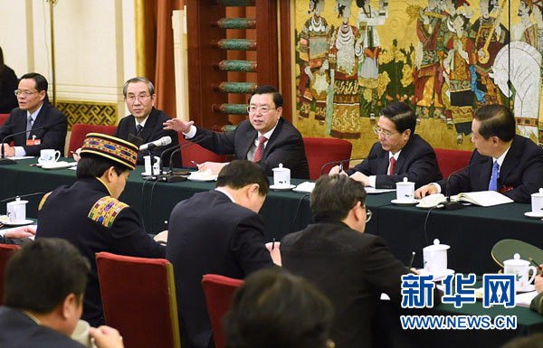 3月9日,中共中央政治局常委、全國人大常委會委員長張德江參加十二屆全國人大二次會議廣西代表團的審議。 新華社記者劉建生攝