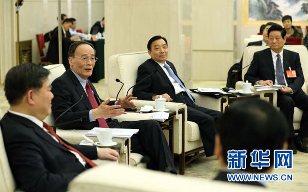 3月9日,中共中央政治局常委、中央紀委書記王岐山參加十二屆全國人大二次會議陜西代表團的審議。 新華社記者劉衛兵攝