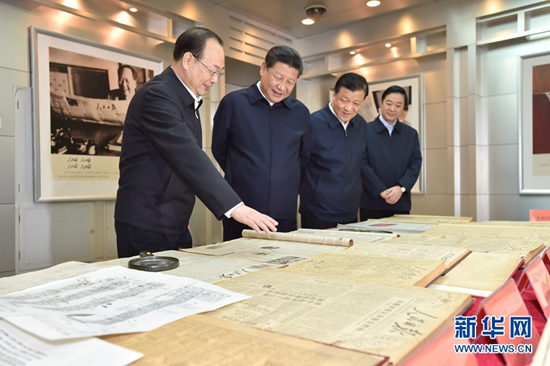 2月19日,中共中央總書記、國家主席、中央軍委主席習近平在北京主持召開黨的新聞輿論工作座談會,并到中央新聞單位調研。這是習近平在人民日報社了解人民日報發展歷程。新華社記者 李濤 攝