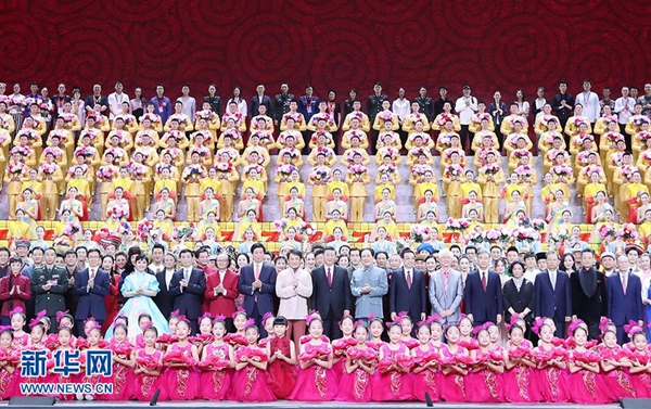 全場(chǎng)起立,共同高唱《歌唱祖國》。習(xí)近平等走上舞臺(tái)同晚會(huì)演職人員親切握手,祝賀演出成功,并與大家合影留念,全場(chǎng)響起經(jīng)久不息的熱烈掌聲。