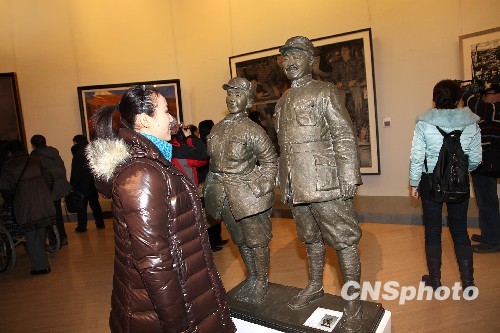 圖為中國美協主席劉大為,中國美協分黨組書記、副主席吳長江參觀畫展。中新社發 王保勝 攝