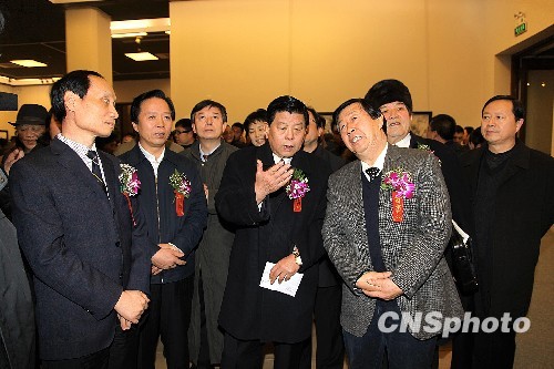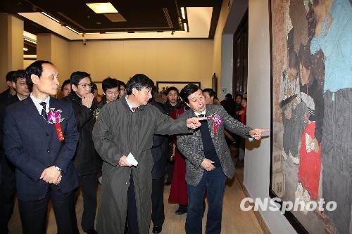 圖為中國文聯黨組書記胡振民(右二) 、中宣部副部長翟衛華(左)、文化部副部長王文章(左二)出席畫展開幕式。中新社發 王保勝攝