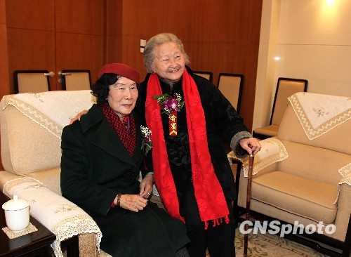 圖為徐悲鴻夫人廖靜文(左)和李可染夫人鄒佩珠出席開幕式。中新社發 王保勝 攝