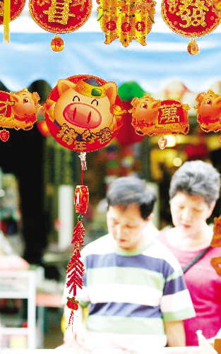 圣誕節(jié)剛一過,新加坡的大街小巷和商業(yè)區(qū)就換上了傳統(tǒng)的春節(jié)盛裝,大大小小的紅燈籠高高掛起,年畫也貼了出來,一片喜氣洋洋。牛車水年市各個中國傳統(tǒng)式的店屋與商場內(nèi),年貨擺得滿滿的,購買年貨的人們絡(luò)繹不絕。大街小巷都播放著傳統(tǒng)的新年歌曲,好不熱鬧。