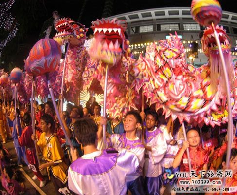 在這個繁華發(fā)達(dá)的現(xiàn)代化國家里,很多優(yōu)秀的中國傳統(tǒng)節(jié)慶文化得以保存。新加坡人的很多新年習(xí)俗也與中國基本上一樣,如家家戶戶要大掃除,門上要貼春聯(lián),要倒貼“福”字。除夕夜全家老小要在一起吃團圓飯,孩子們要守歲以便延長壽命,到了午夜時分家長們要祭神拜祖先,大年初一開始晚輩要帶著桔子給長輩拜年,長輩要給小孩“紅包。