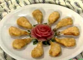 慈禧太后對飲食十分講究,要是吃得不稱心,就要發脾氣。有一天,小太監端上幾道京幫大菜,她掃了一眼,鼻孔里"唔"了一聲,手一擺說道:"又是老一套!"一句話,嚇得廚師心里直哆嗦,連忙重新做了幾道湖廣名菜端上去??墒撬忠凰π渥诱f:"端下去!"這可更難熬了御膳房一班廚師們,商量來商量去,也想不同什么好名堂來。這時,御廚里有一位蘇幫廚師,姓王名阿坤。他想,"鮮"字拆開是"魚"和"羊",何不用魚和羊來試做一道新鮮菜呢?于是,他就以魚肉、羊肉為主,配上蝦仁、香菇、冬筍和各種佐料,拌和在一起,放在籠屜里蒸熟;然后用網油包成象一只一只的雞腿形狀,再滾上一層蛋粉,下入油鍋里一氽,再將其每一只的細頭插上熟筍,乍一看,簡直象雞腿一樣,雞皮油光锃亮,連毛孔都隱約可見。慈禧覺得這道菜的樣子不僅味道鮮美,而且干中有鹵,脆中有柔,便親自賜名"龍鳳腿"。