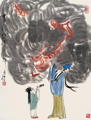 張僧繇被逼得沒有辦法,不得不答應給龍“點睛”。這一天,在寺廟墻壁 前有很多人圍觀,張僧繇當著眾人的面,提起畫筆,輕輕地給兩條龍點上眼睛。 奇怪的事情果然發生了,他剛點過第二條龍眼睛,突然間天空烏云密布,狂風四起,雷鳴電閃,在雷電之中,人們看見被“點睛”的兩條龍震破墻壁凌空而起,張牙舞爪地騰云駕霧飛向天空。