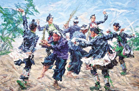 法國藝術家布里艾爾的銅、木結構作品《眩暈》,簡明而生動地刻畫了城市居民對綠色自然的渴望。柬埔寨畫家欽·索蒂的布面油畫以圍困村莊的熊熊烈火沖擊觀者的視覺,作品《不要燒毀森林》,以最直白的方式表達人類對生態保護的訴求。畢建勛的中國畫《子非魚》以寫實的畫面敘述了中國古代哲人莊子與惠子的對話,暗喻愛護生物、保護環境的人類恒久理念。