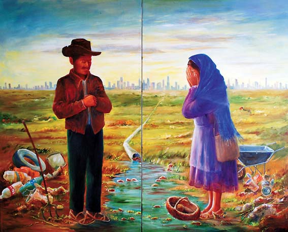 與之形成對比的是,“有一棵一次性筷子形成的筷子樹,遠遠看去金碧輝煌、枝繁葉茂,近處細看,不免讓人心生愧疚,是我們的日常的消費讓曾經茁壯成長的大樹變成了一根根方便筷。”中國藝術家羅志楠用金色的筷子沖擊著我們的視覺,震撼著我們的心靈。這兩張有代表性的作品,呈現出本屆雙年展“生態與家園”主題創作的兩大趨勢:一類是肯定性的、贊美性的,側重于對保護生態環境的自覺意識和措施的積極肯定,對建設生態平衡的理想家園的熱情贊美;另一類是批判性的、警示性的,側重于對破壞生態環境的惡劣思想和行為的尖銳批判,對生態危機嚴重性的深刻警示;在形式上,這些作品仍然以繪畫、雕塑形式為主,同時也吸納了一些裝置、影像等新媒體形式,其目的是為了更加多角度、全方位地表現“生態與家園”這一內涵極其豐富的主題。
