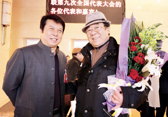 11月20日,第九次全國文代會的時鐘正在向時間的焦點推進,全國各地的文藝家代表團懷著激動喜悅的心情陸續抵京,聚首這一期待已久的盛會。中國文聯黨組領導親切迎接和看望代表們;代表們熱烈交流,互致問候。車站里、機場內、駐地中,握手、擁抱、交談,鮮花、掌聲、笑聲……美好定格于一個個瞬間,無數瞬間見證著一個歷史性時刻!圖為中國文聯黨組副書記、副主席覃志剛(左)和北京市文聯主席金鐵霖在一起。