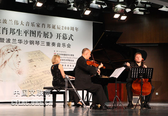 10月12日,由波蘭共和國駐華大使館、中國文聯和中國音協聯合主辦的《紀念波蘭偉大音樂家肖邦誕辰200周年——肖邦生平圖片展》在中國文藝家之家開幕。圖為波蘭華沙鋼琴三重奏小型音樂會。張大勇 攝
