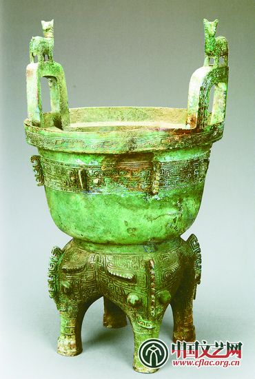 “這個問題還需進一步探討。你看,虎背上靜靜地臥著一只小鳥,揚起脖頸,悠然自得,與身下那只兇猛大蟲形成動與靜、強與弱、大與小的鮮明對比,有點黑色幽默的感覺;鳥兒雖然渺小,卻全然不懼猛虎之威嚴,宛若猛虎的駕馭者,頗有以柔克剛之哲學(xué)意味。這件青銅虎應(yīng)是傳說中‘虎方’國的圖騰之物。”首都博物館青銅器專家馮好接著說:“當然,也有人認為這是商王朝為掌控青銅資源派貴族南征開疆拓土的佐證。不管定論如何,這些器物憑借其高超的工藝和獨特的風格,推翻了長期以來流行的‘江西在漢代以前是荒蠻之地’的說法,證實江西曾經(jīng)在青銅時代有過和中原文明并行發(fā)展、平分秋色的歷史階段。”這點在此次展覽中也有所體現(xiàn),不只禮器,兵器、工具、農(nóng)具也一應(yīng)俱全。例如商代獸面紋青銅溫鼎和商代獸面紋提梁方腹青銅卣,最為奇特之處在于它們都具有雙層底:前者夾層之間可置炭火給鼎食保溫,有點像今天的保溫盒,夾層一側(cè)有上下啟合的活門,用以塞入炭火,可謂匠心獨運,極富生活智慧;后者雙層底的夾層可置炭火溫酒,也可將卣浸入熱水中通過腹部開口加速酒溫上升,頗為新奇,堪稱上古時代的水熱溫酒器,同時提梁還可拆卸下來,表現(xiàn)出極高的工藝技術(shù)。