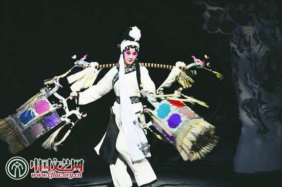 京劇《暗河渡》由臺灣戲曲學院京劇團當家花旦朱民玲和當家小生趙揚強領銜主演。劇中結合西方歌劇的表現方式,從臺灣傳統民俗紙扎中尋找靈感進行舞美設計,在寫實與寫意間展現演員細致的表演功力。新華社發 吳景騰 攝