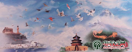 圖稿以藍(lán)天祥云為背景,從左往右依次為雅典衛(wèi)城、愛琴海、北京天壇、長城和珠穆朗瑪峰等著名人文景觀和自然景觀,象征奧運(yùn)會(huì)從雅典傳遞至中國。空中飛翔著29只來自五大洲的吉祥鳥,寓意世界各國運(yùn)動(dòng)健兒相聚北京。吉祥鳥不僅代表了和平與和諧,更是象征著“更高、更快、更強(qiáng)”的奧林匹克精神。