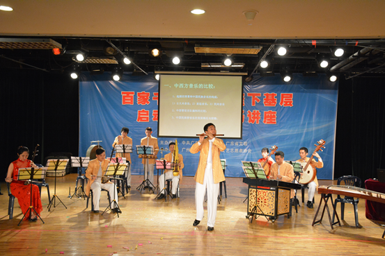 啟動(dòng)儀式后,廣東省文聯(lián)副主席、廣東省音協(xié)副主席、廣東民族樂團(tuán)團(tuán)長,國家一級(jí)演奏員陳佐輝作了題為《民族音樂鑒賞》專場(chǎng)講座,為“百家千場(chǎng)藝術(shù)講座下基層”拉開序幕。陳佐輝重點(diǎn)介紹了嶺南民樂的傳承與發(fā)展,講課形式生動(dòng)活潑、詼諧幽默,他一邊講解一邊請(qǐng)廣東民族樂團(tuán)的部分青年演員作各類民樂樂器演奏示范及經(jīng)典民樂演奏。歡快的音符似從樂手們的指間流出,現(xiàn)場(chǎng)沸騰起來,場(chǎng)內(nèi)掌聲如潮。參加活動(dòng)的觀眾表示,這種套餐形式的講座帶給觀眾享受與快樂,既高雅又親民,非常幸運(yùn)在家門口就能得到如此高質(zhì)量的文化惠民服務(wù)。