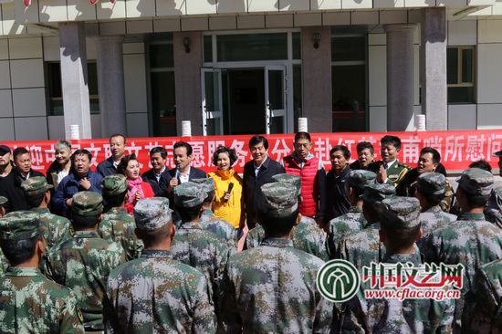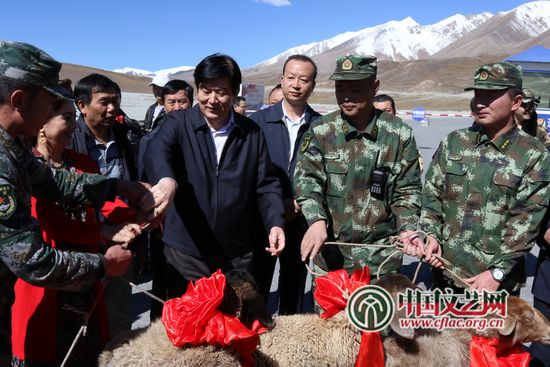 中國文聯黨組副書記、副主席李屹為邊防戰士贈送物資。中國文藝網 蘇銳 攝