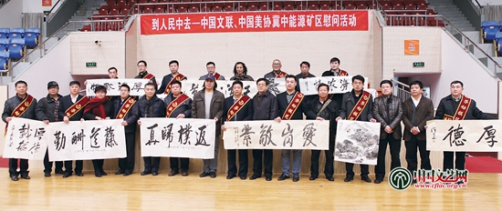 2014年12月10日,中國文聯、中國美協赴冀中能源礦區慰問活動在冀中能源股份公司邢臺礦舉行。圖為美術家向冀中能源股份公司的勞模們贈送書畫作品