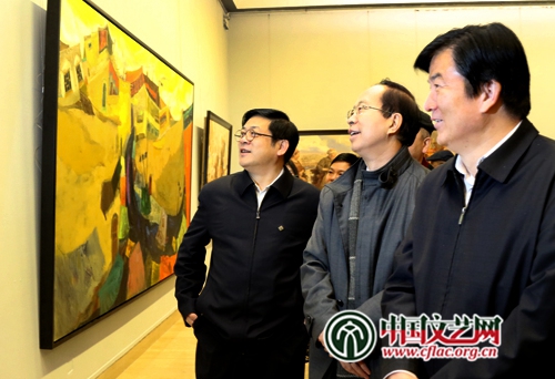 中國(guó)文聯(lián)黨組副書(shū)記、副主席李屹,中國(guó)文聯(lián)黨組成員、副主席左中一,中國(guó)美術(shù)家協(xié)會(huì)分黨組書(shū)記、駐會(huì)副主席、秘書(shū)長(zhǎng)徐里觀看畫(huà)展 中國(guó)文藝網(wǎng) 段冉攝