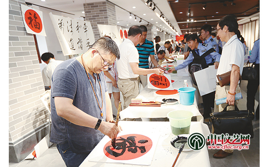 一人端坐面帶微笑,一人揮筆精心描摹。畫像中人物神態、動作清晰,畫面層次分明,色彩和諧,作品傳神又不失生動活潑,因而受到干警們的歡迎。這是漫畫家志愿者笑臉兔、如果果等為干警們畫像的場景,他們中大多數人還是第一次為政法干警畫像。來自廣州市書協的秦建中、呂志強等8位書法家志愿者現場潑墨揮毫,向政法干警贈送書法作品,干警們圍在桌旁饒有興致地欣賞,愉悅的笑容掛在臉上。