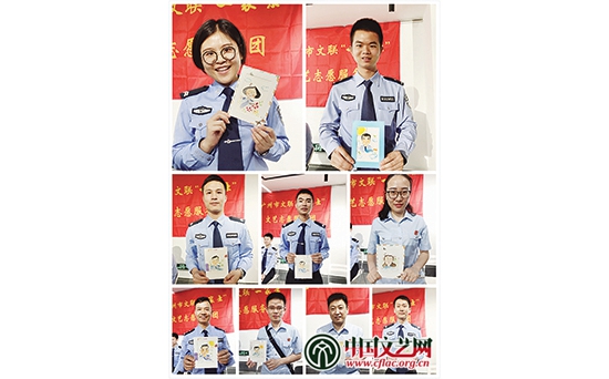 在廣州文藝市民空間二樓的嶺南活力非遺藝術館,幾十位廣州藝術家志愿者忙得熱火朝天,書法家現場揮毫,畫家和漫畫家為干警們畫像,攝影家為干警拍肖像,剪紙藝術家則為干警肖像剪紙……