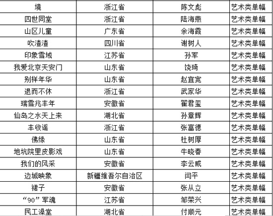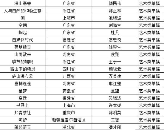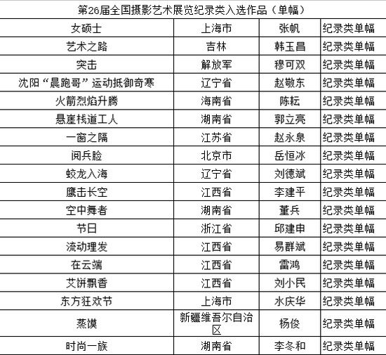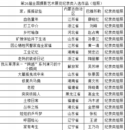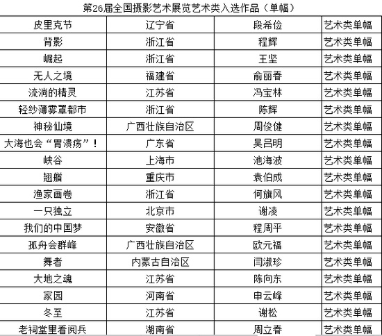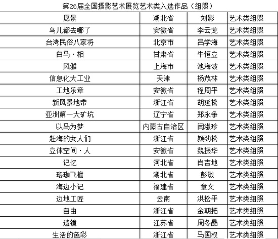 中國文學(xué)藝術(shù)界聯(lián)合會、中國攝影家協(xié)會主辦的第26屆全國攝影藝術(shù)展覽,收到來稿作品94273件(212065幅),其中:紀(jì)錄類作品53842件,藝術(shù)類作品38275件,商業(yè)類作品1954件,多媒體類作品202件。本屆全國攝影藝術(shù)展覽經(jīng)過初評、終評選出擬入選作品418件。
