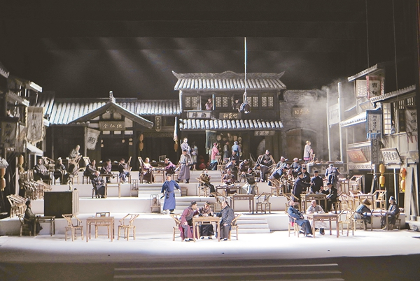 隨著第三聲鐘響,燈光漸熄,大幕徐徐開啟。與北京人藝版《茶館》不同的是,四川話版《茶館》以倒敘方式入手,老年的王利發(fā)、常四爺、秦二爺拄著拐杖,踏著蹣跚的腳步出場,北京人藝版最經(jīng)典的一幕“仨老頭撒紙錢”的部分被挪到了戲的序幕,這也令人大吃一驚。而大幕一拉開,便引得臺下觀眾發(fā)出了贊嘆,似山城碼頭層層疊疊的階梯式舞臺擺起了龍門陣,熱氣騰騰的市井氣息撲面而來,隨后麻辣燙般味道十足的叫賣聲此起彼伏,手巾板兒滿天飛,春熙路生意興隆的大茶館中上演著悲歡離合,立刻讓人充滿期待。