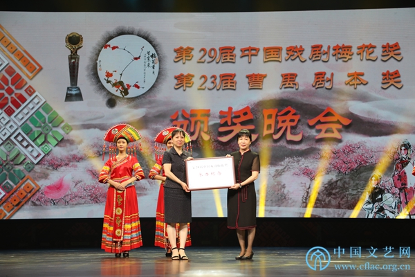 4月26日,第29屆中國戲劇梅花獎和第23屆曹禺劇本獎在廣西南寧頒獎。圖為中國戲劇家協會分黨組副書記顧立群向廣西壯族自治區黨委宣傳部副部長呂潔贈送承辦紀念牌。中國文藝網 郝紅霞 攝