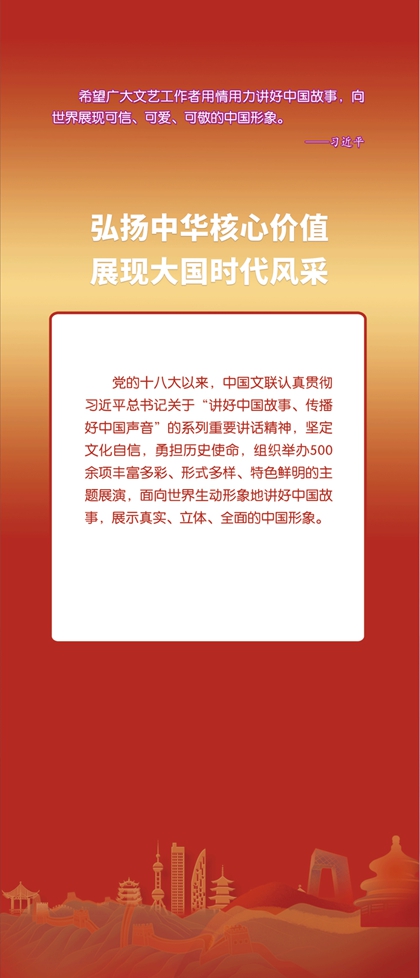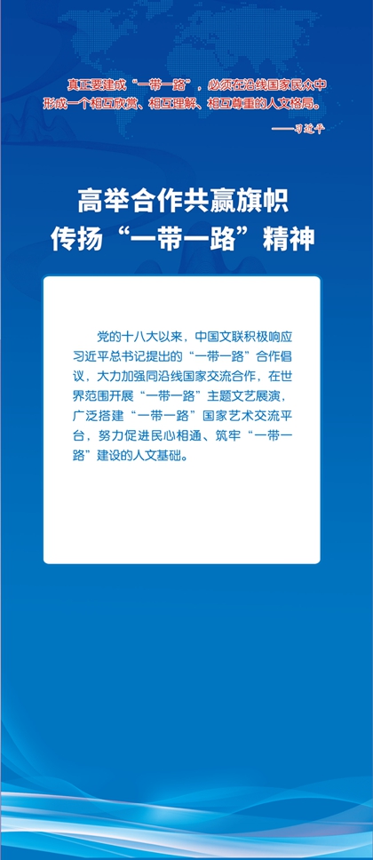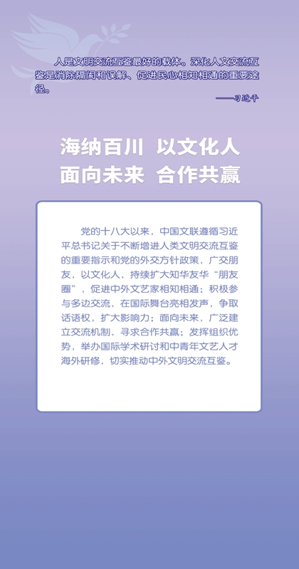 黨的十八大以來,在習(xí)近平新時代中國特色社會主義思想指引下,中國文聯(lián)堅定不移貫徹中央決策部署,圍繞中心、服務(wù)大局,遵循黨的外交方針和布局,以習(xí)近平總書記關(guān)于構(gòu)建人類命運共同體、建設(shè)“一帶一路”、講好中國故事、推動世界文明交流互鑒等重要思想為引領(lǐng),發(fā)揮組織優(yōu)勢和專業(yè)優(yōu)勢,堅持“請進(jìn)來”與“走出去”相結(jié)合,組織開展深層次、多領(lǐng)域的人文交流和主題鮮明、內(nèi)容豐富、形式多樣的文藝展演活動,努力推動中華文化走出去,擴(kuò)大中華文化的國際影響力。同時,中國文聯(lián)堅決貫徹中央對港澳和對臺工作方針,聚焦“做人的工作”,發(fā)揮引領(lǐng)作用,廣泛團(tuán)結(jié)港澳臺文藝組織、團(tuán)體和文藝家,在共同弘揚和繁榮中華文化的過程中增進(jìn)民族情感和文化認(rèn)同,為筑牢中華民族命運共同體作出了應(yīng)有的貢獻(xiàn)。