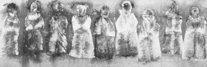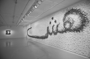 在精美細致的德化百花浮雕壁畫上進行火藥爆炸創作,也是蔡國強的新創。這組巨大的壁畫是在德化特制,以傳統的塑花工藝制作,非常逼真,但也非常脆弱易損。蔡國強在上面用火藥炸出一句阿拉伯文“脆弱”。蔡說,他這次學會了這個阿拉伯字,很有感悟。過去的作品太大,追求強悍,現在悟到不妨追求“脆弱”,“脆弱”也很重要。