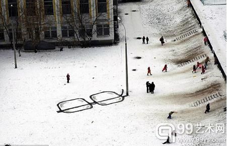 將街頭燈柱想象為眼鏡架,在雪地上畫出鏡框及右側鏡架