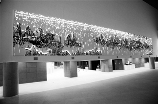 潘公凱2011年威尼斯雙年展中國館的作品《融》,以水墨為背景,電子媒介的使用讓作品從遠處看像下雪一樣。 今日美術館供圖