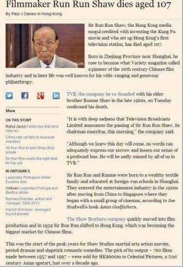 《每日電訊報》——功夫電影先驅者邵逸夫去世