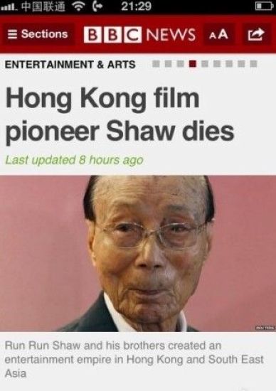 北京時間1月7日消息,香港電影大亨邵逸夫爵士于當地時間周二去世,各大國外媒體也第一時間發文,悼念這位亞洲傳媒業的大亨、電影業的先驅者、功夫電影的締造者。