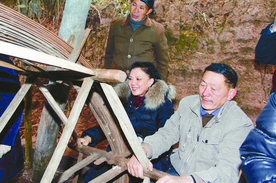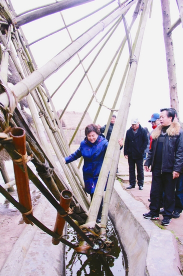 藝術(shù)家體驗(yàn)古人以卓筒井汲取鹽鹵的智慧,中為王小燕
