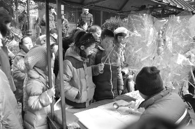 在青島天后宮新正民俗文化廟會上,民間藝人制作的糖畫吸引了小朋友們的眼球。 劉海濤 攝