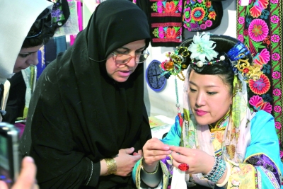 2012年6月,在伊朗德黑蘭舉辦的中國婦女民間手工藝品展上,來自中國黑龍江省牡丹江渤海民族工藝品有限公司的繡娘向觀眾展示靺鞨繡技藝。(牡丹江渤海民族工藝品有限公司供圖)