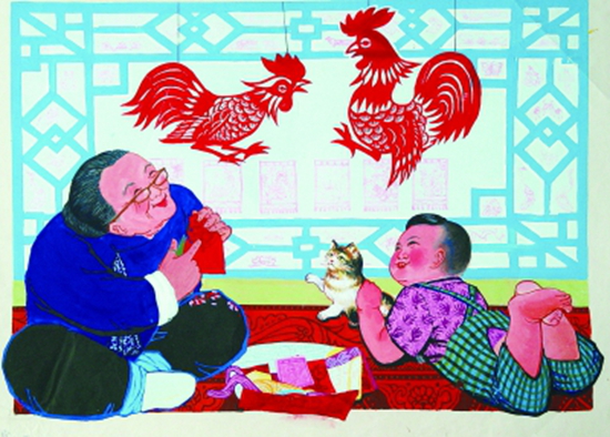 “解放前,日照民間有畫抹畫的傳統,農村里有些會畫抹畫的人通常在年節作畫,并贈送給鄰居朋友,貼在門、窗、灶臺等處,作用跟民間的門神、灶王爺、財神爺相似。”日照市美術館副館長丁萬里說,“‘文革’期間,日照組織過幾期美術學習班,加強對美術愛好者的培訓。到了80年代,有了‘農民的畫’這個叫法,慢慢的又簡化成了農民畫。”多年從事農民畫研究和培訓工作的丁萬里告訴記者,日照農民畫以表現農村的原生態、海上民俗為主,蘊含濃厚的鄉土氣息,顏色鮮艷、畫面飽滿、造型夸張。“內容上富有鄉土氣息,表現形式大俗大雅。”