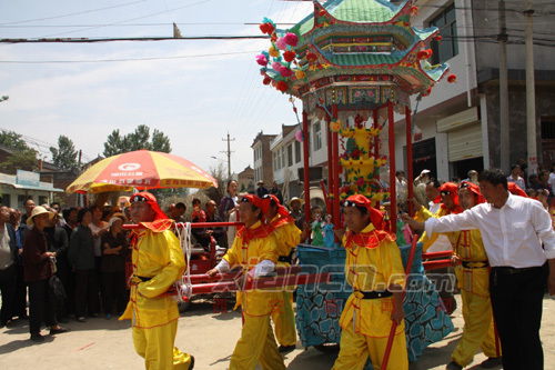 昨日是周至縣終南鎮豆村一年一度的“大蠟會”,六七位漢子抬著一尊3層寶塔形的大蠟向關公敬獻,吸引了上萬人觀看。