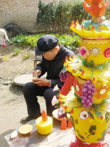 趙立功說灌制豆村大蠟的秘方是經過歷代大蠟藝人的調制流傳下來的,所以一米多高的大蠟遇高溫不熔不化,裝飾用的飛禽走獸、花鳥魚蟲也是蠟做的,放置時間再長也不變形、不褪色。在周至縣文化館的非物質文化遺產展廳里,記者見到了兩個老人幾年前做的大蠟,在沒有任何保護下,至今還色彩艷麗、紋飾如新。