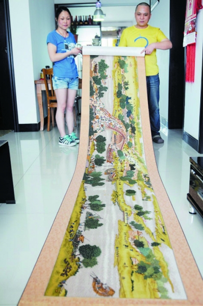 龍鳳英與丈夫展示十字繡《清明上河圖》。 朱炎皇 攝