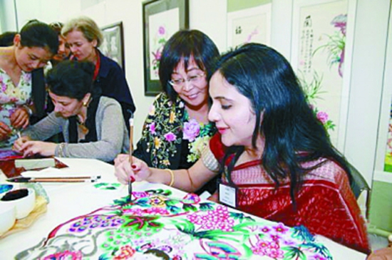 來賓們還欣賞了《中國(guó)剪紙藝術(shù)薈萃》專題影片,參加了由第三代中國(guó)剪紙藝術(shù)家——周淑英主持的剪紙工作坊。來自英國(guó)、捷克、印度、菲律賓、孟加拉、巴拉圭和世界旅游組織等18個(gè)國(guó)家和國(guó)際組織的女外交官與外交官夫人們圍坐一起,饒有興趣地跟著周淑英老師學(xué)起了剪紙,一招一式有模有樣。當(dāng)一只只“老虎”在她們手下展開時(shí),大家紛紛發(fā)出“不可思議”的贊嘆。