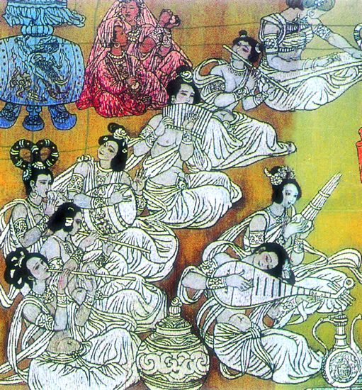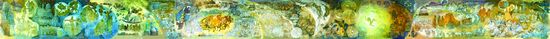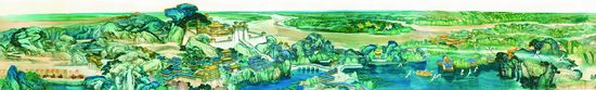 ◎ 賞析4:《絲綢之路》,這是一鋪宏偉的壁畫,起源于他1985年的絲綢之路考察,但是融入了豐厚的歷史知識(shí),中西古來(lái)的視覺圖像,特別是注入了瑰麗的想象。全圖描繪從長(zhǎng)安到羅馬的一路風(fēng)光,400多個(gè)人物姿態(tài)迥異,神采不同,建筑車船、動(dòng)植物、服飾環(huán)境,千變?nèi)f化,豐富多彩。有古典樂(lè)舞的典雅,民族舞蹈的熱烈,飛天的飄逸,商貿(mào)交易的喧鬧,異域風(fēng)情的奇幻,民間傳說(shuō)的神奇,圖騰文化的詭譎,宗教文化的神奧,耕耘狩獵的生氣,還有海上絲綢之路的船隊(duì)。他以包羅萬(wàn)象的大手筆,概括了中西交流的歷史,又以中國(guó)漢唐壁畫傳統(tǒng)為主體,整合了中西古今畫法的絢爛,有實(shí)有虛,有特寫,有穿插,步移景換,情隨境生,光輝隨光環(huán)不斷擴(kuò)展,詩(shī)意在繽紛流動(dòng)中閃光。有隋唐的燦爛、西域的絢麗、波斯的細(xì)密、寫實(shí)的凝重、裝飾畫的奇妙。這幅宏偉壯闊的作品,是漫長(zhǎng)年代的重疊,是東西跨度的濃縮,概括了中西交流的生態(tài),古人說(shuō)“籠天地于形內(nèi),挫萬(wàn)物于筆端”,楊曉陽(yáng)說(shuō)“匯時(shí)空之長(zhǎng)風(fēng),拂意象之搖動(dòng)”,確實(shí),此畫分量重而氣韻活,可以說(shuō)是一曲絲綢之路雄渾壯麗的交響詩(shī)。