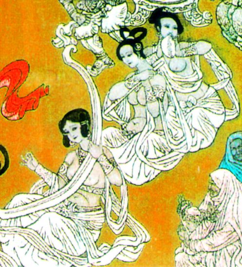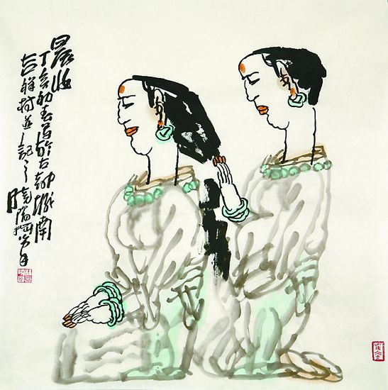 ◎ 賞析8:《雪域》2004,這件作品,畫的是青藏高原的宗教生活,是雪域朝圣的人物活動(dòng)。站立的人物兩虛兩實(shí),有動(dòng)有靜,遠(yuǎn)近的幾處土坡,其實(shí)是五體投地磕長(zhǎng)頭的朝圣者,近處,歷經(jīng)滄桑的老人弓腰低頭,向天真的少女講述著深?yuàn)W的道理。人物不管是畫形,還是畫影,都很傳神,但妙處在意境,在對(duì)天人關(guān)系的哲思。好的寫意畫“意在畫外”,妙在造境。造境展示畫家的思想境界,尤其是具有創(chuàng)新意識(shí)的思想境界。惟其如此,這件作品的深刻內(nèi)涵才使人內(nèi)心難以平靜。