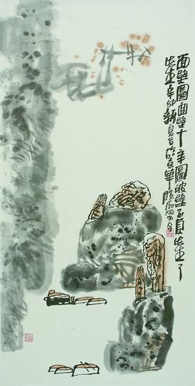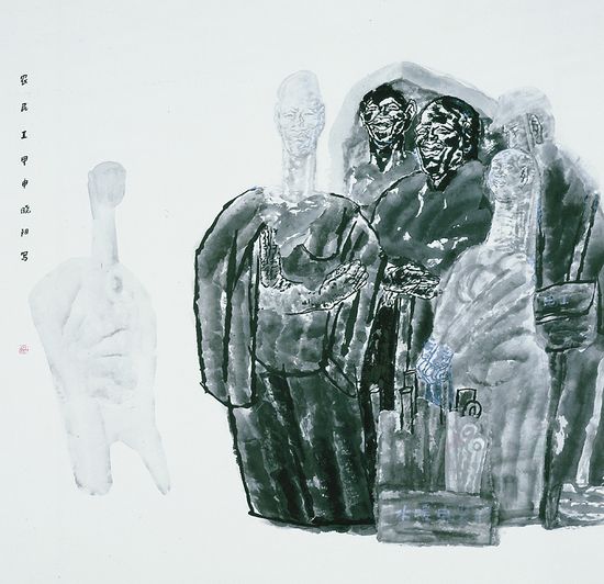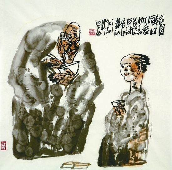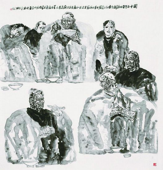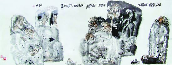 ◎ 賞析9:《生生不息》2008,《茶有道》2007。前一幅,人畫在石頭一樣的團(tuán)塊里,通過(guò)親情關(guān)系和人倫關(guān)系的圖式,解讀了“天行健,君子以自強(qiáng)不息”的民族文化精神。后者,在圖像和題跋的結(jié)合中,透過(guò)“飲者悟透境界不同”,啟導(dǎo)觀者參悟人生與藝術(shù)創(chuàng)作的真諦。兩幅作品有一個(gè)共同點(diǎn),那就是以他喜愛的古代民間石刻入畫,特別是栓馬樁和炕頭獅,不僅取其單純的造型,更取其大樸不琢的氣韻。他的這類作品,在意象上,在寫實(shí)的基礎(chǔ)上,經(jīng)過(guò)提煉取舍,走向意造。在筆墨上,把勾勒法、勾皴法、潑墨法、破墨法、積墨法有機(jī)地結(jié)合起來(lái),追求從容而忘情,明麗而蒼茫。在視覺上,新穎而有沖擊力。