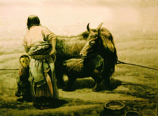 他這種人物畫,主要畫現(xiàn)代題材,取材西北黃土高原,關(guān)注農(nóng)民命運(yùn),表達(dá)深層民族情結(jié),描繪西北農(nóng)民的日常生活情狀,表現(xiàn)他們的質(zhì)樸、寬厚、純樸之美。也畫傳統(tǒng)題材,借助膾炙人口的典故和成語(yǔ),描繪積淀了傳統(tǒng)文化和美學(xué)風(fēng)范的人物,謳歌他們的精神境界。