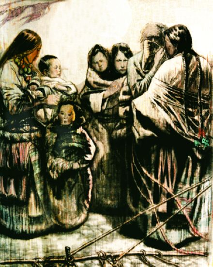 ◎ 賞析2:《黃河的歌》1983,《大河之源》前幅作品也是描繪黃河船工的,如果說(shuō)上一幅像紀(jì)念碑,那么這一幅更像抒情詩(shī)。不是畫船工的勞作,是畫他們的休息。畫面上,安靜的夜晚,靜下來(lái)的黃河,溶溶的月光,停泊的大船,船艙中的船工。船工有老有少,有的用飯,有的抽煙,船頭一人吹嗩吶,大家入神地傾聽。悲切而歡快的嗩吶,含著風(fēng)聲水聲,在靜夜中回蕩,給人安詳靜寂中的遐思與憧憬。畫法還是水墨寫實(shí)的,但處理光線比較自由,虛實(shí)藏露也都圍繞著刻畫人物和渲染意境,以靜襯動(dòng),用無(wú)聲畫有聲。在寫實(shí)的作品中,注入了詩(shī)情,富于生活韻味。《大河之源》中楊曉陽(yáng)對(duì)黃河的描繪,投注了極大的熱情,這是一套組畫,七幅之一。他描繪黃河源頭的藏族群眾,親切雍容,淳厚樸素,充滿內(nèi)美,容易使人想到法國(guó)米勒的作品,表現(xiàn)了對(duì)祖國(guó)對(duì)黃河兒女的深情,很像是包孕深厚的史詩(shī)。他這些水墨寫實(shí)的作品,發(fā)揚(yáng)了劉文西的傳統(tǒng),體現(xiàn)了黃土畫派“熟悉人,嚴(yán)造型,講筆墨,求創(chuàng)新”的風(fēng)采,但在開掘動(dòng)人的詩(shī)情上,有了新發(fā)展。