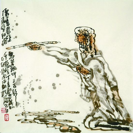◎ 賞析10:《懷素書壁》2007,他有一批大寫意作品,以達(dá)摩面壁、懷素學(xué)書為題。通過(guò)歷史人物的文化積淀,刻畫其精神面貌,象征某種精神境界,給人以有益的啟迪。這件作品畫唐代草書大家懷素和尚。根據(jù)《自敘帖》中的“忽然絕叫三五聲,滿壁縱橫千萬(wàn)字”的詩(shī)句,畫出了懷素的激情,他跪在那里,張口大叫,身體前傾,全力以赴,對(duì)壁直書,筆下墨汁淋漓。但身旁是兩方大硯、墨盤和無(wú)數(shù)的筆,這不禁使人想到關(guān)于懷素刻苦練字的另一則故事,所謂“筆成塚,墨成池”,楊曉陽(yáng)把二者概括在一件作品里,雖然畫的是激情噴薄,大筆揮灑,但通過(guò)細(xì)節(jié),點(diǎn)出了畫外意,揭示了即興抒發(fā)必須以勤學(xué)苦練為基礎(chǔ),含義也就自然深刻了。