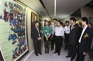 東北亞藝術(shù)中心董事局主席周華起(右)陪同中國文聯(lián)分黨組副書記覃志剛(右二),吉林省委常委、省委宣傳部長荀鳳棲參觀。