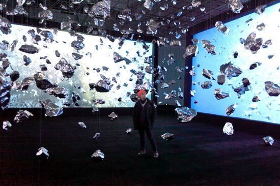 11月26日,雕塑藝術家展望的展覽《我的宇宙》在北京798尤倫斯當代藝術中心開幕。展覽運用靜態(tài)裝置和視頻影像的手法呈現(xiàn)宇宙爆炸的壯觀景象。展覽至2012年2月25日結束。圖為觀眾在北京798尤倫斯當代藝術中心觀看展覽《我的宇宙》 。