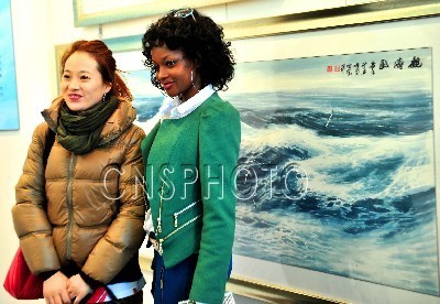 12月9日,由中國人民對外友好協會等單位主辦的“中國國際文化藝術博覽會”在北京全國農業展覽館開幕。來自賽拉利昂的畫家愛達·楊(右)隨丈夫中國畫家楊彥參加了此次展覽,并與中國朋友在周智慧作品前合影留念。愛達·楊出生在賽拉利昂,受教于EMIBEXCOLLEGE大學商業管理專業,出演過三部電影,兩次任女主角。(鄒憲 攝)